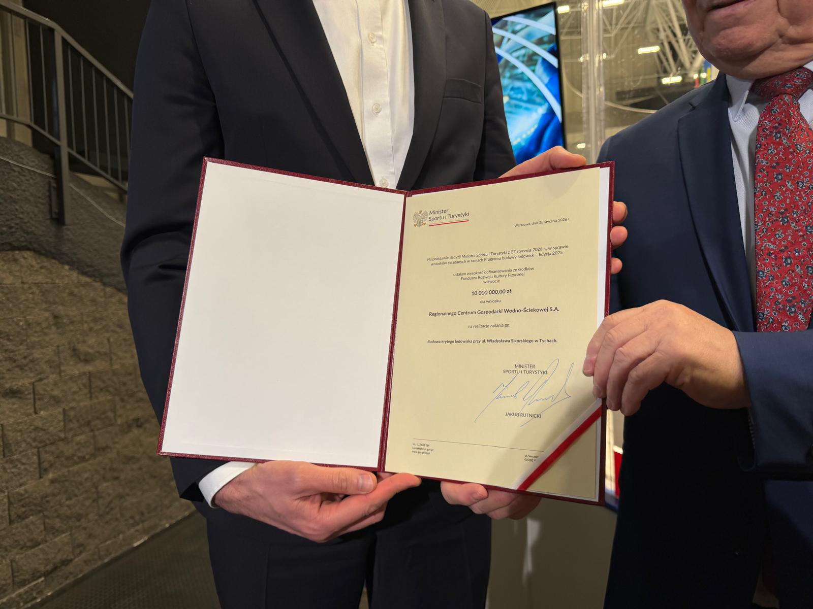 Podczas spotkania Minister przekazał na ręce Prezydenta Miasta Tychy, Pana Macieja Gramatyki, decyzję o przyznaniu 10 mln zł dofinansowania na budowę lodowiska, które ma powstać przy kompleksie Wodnego Parku Tychy. Realizacja inwestycji została powierzona RCGW S.A.