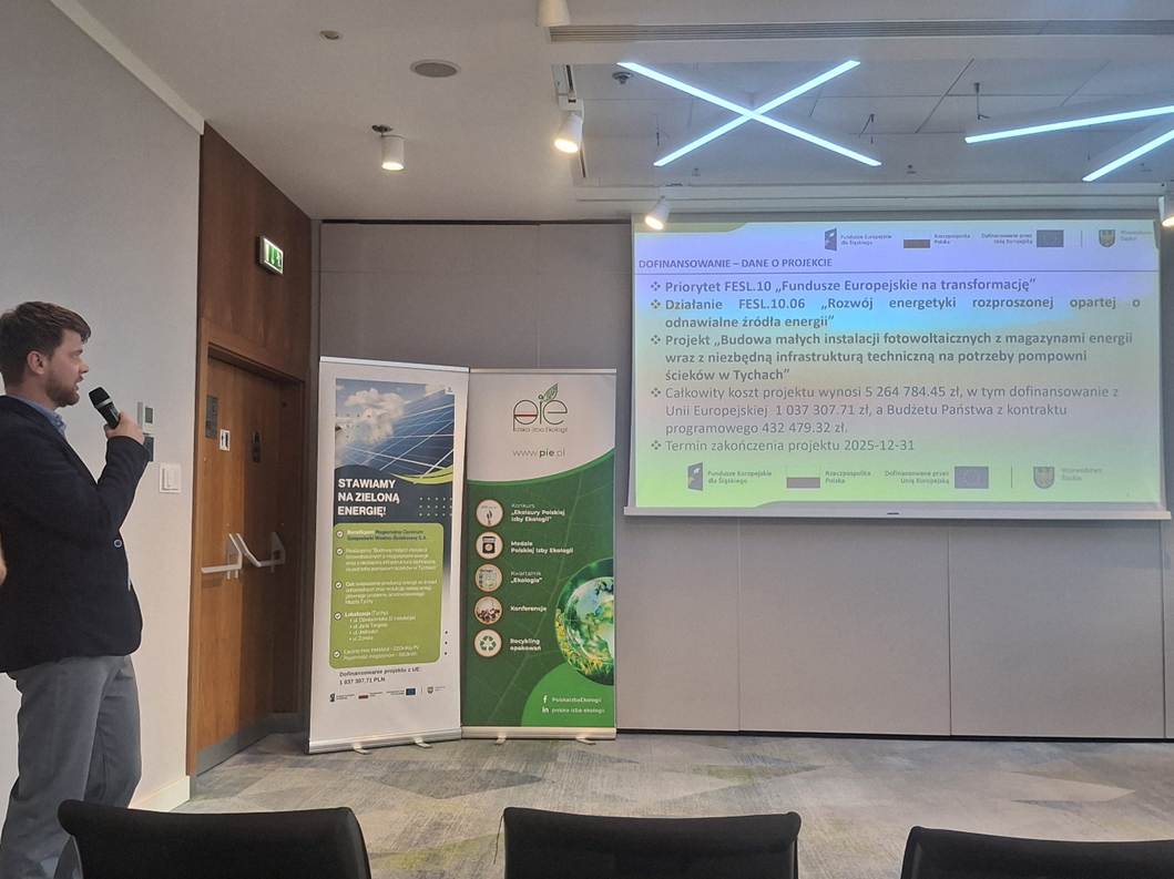Projekt “Budowa małych instalacji fotowoltaicznych z magazynami energii wraz z niezbędną infrastrukturą techniczną na potrzeby pompowni ścieków w Tychach” - w ramach Funduszu Europejskiego dla Śląskiego 2021-2027 (Fundusz na rzecz Sprawiedliwej Transformacji) został zaprezentowany w dniu 21.10.2025 na Konferencji Woda cenniejsza niż złoto zorganizowanej przez Polska Izba Ekologii, 21.10.2025r. w Hotelu Courtyard by Marriott w Katowicach