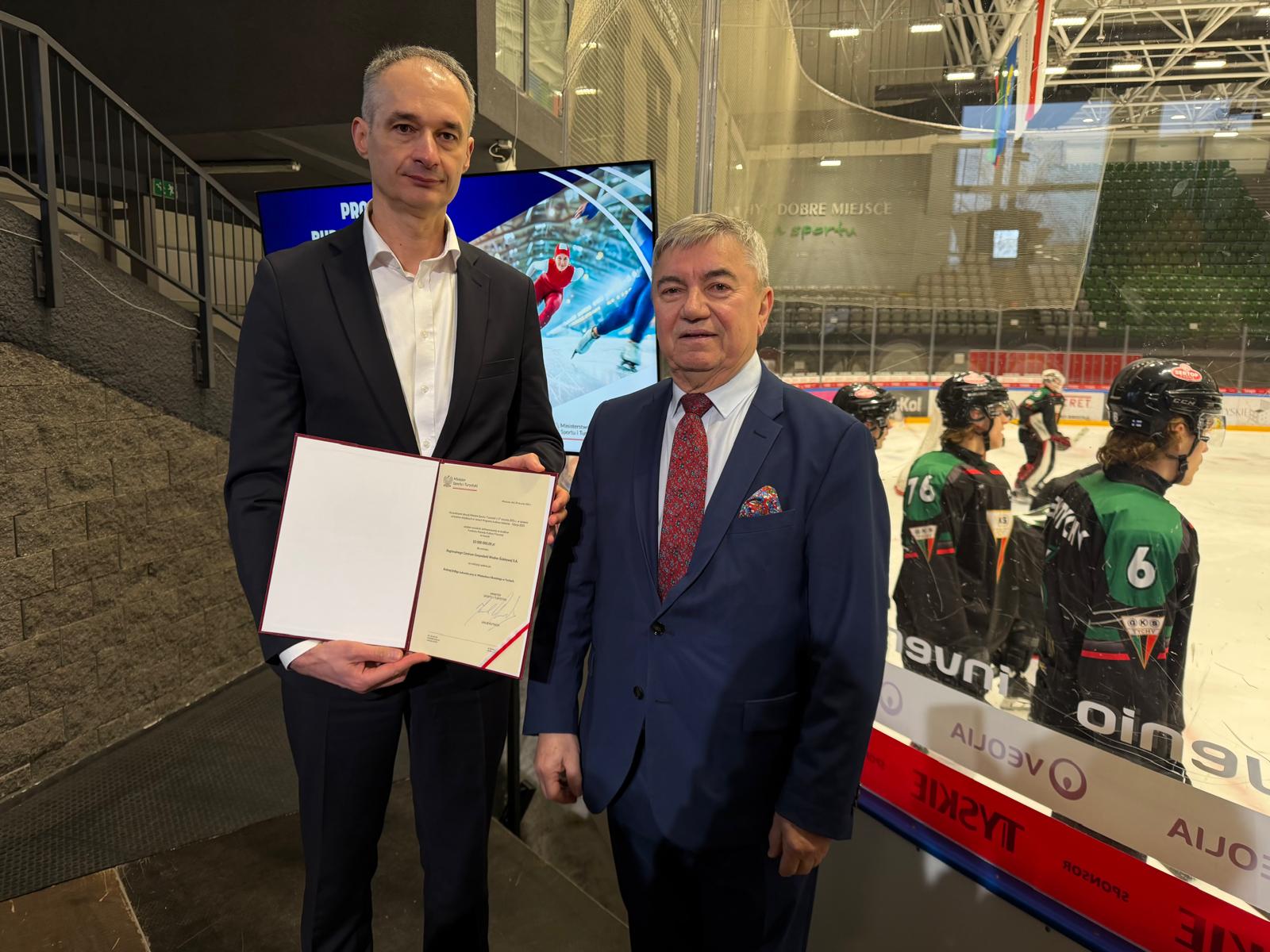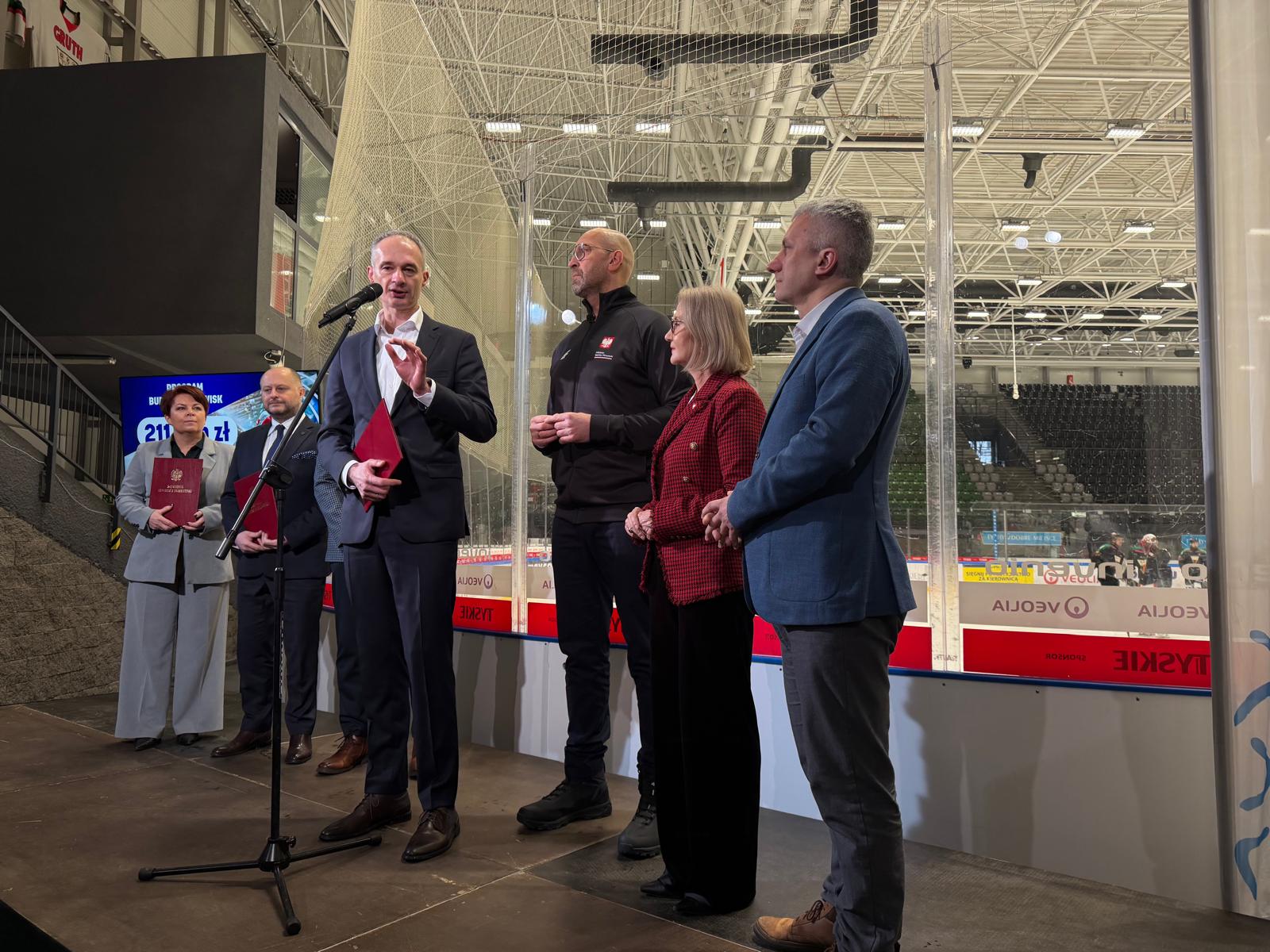 Podczas spotkania Minister przekazał na ręce Prezydenta Miasta Tychy, Pana Macieja Gramatyki, decyzję o przyznaniu 10 mln zł dofinansowania na budowę lodowiska, które ma powstać przy kompleksie Wodnego Parku Tychy. Realizacja inwestycji została powierzona RCGW S.A.